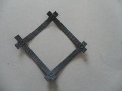 钢塑土工格栅以高强钢丝(0.7国家标准),经特殊处理,与聚乙烯(PE)或聚丙烯(PP),并添加其他助剂,通过挤出使之成为复合型高强抗拉条带,且表面有粗糙压纹,则为高强加筋土工带。由此单带,经纵、横按一定间距编制或夹合排列,采用特殊强化粘接的熔焊技术焊接其交接点而成型,则为加筋土工格栅。